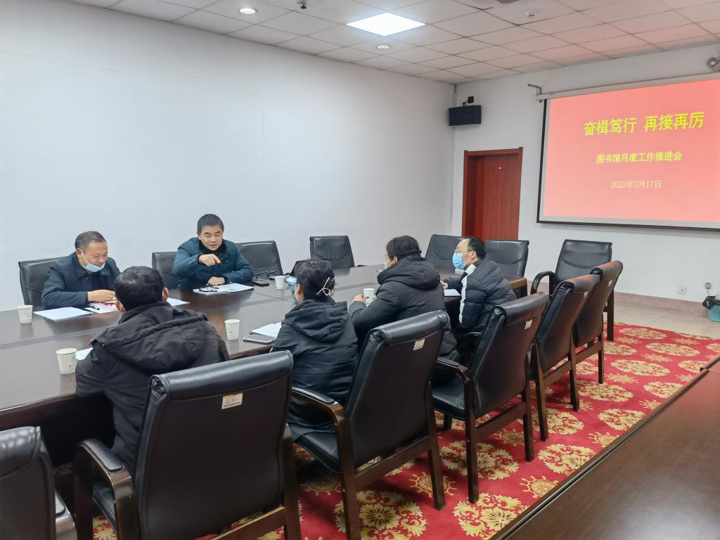 3月17日下午,图书馆在二楼会议室召开以“奋楫笃行 再接再厉”为主题的月度工作推进会,会议由图书馆馆长李明善主持,各部门负责人参加了会议,校党委常委、副校长潘志明莅临现场指导。