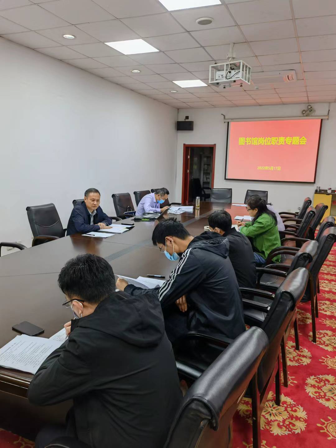 图书馆召开岗位职责专题研讨会 作者:刘敏编辑:刘家雷 审核:李明善 时间:2022-05-18 2022年5月17日上午,图书馆在二楼会议室召开岗位职责专题研讨会,全体馆务会成员和部分职工代表参加了会议,李明善馆长主持会议。 会议专门研究了图书馆各科室和工作人员的岗位职责,与会人员开展了热烈讨论。李明善馆长强调岗位设置与聘用关系到图书馆事业的长远发展,明确岗位职责是岗位设置的关键之举,有利于推进岗位管理的科学化、规范化和制度化。图书馆工作人员应当在明确岗位职责的基础上,努力钻研业务技能,提高服务效率,提升服务质量,更好地服务全校师生。