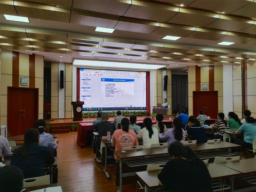 图书馆召开疫情防控专题培训会 作者:刘敏编辑:刘家雷 审核:李明善 时间:2022-08-11 为进一步增强图书馆人的疫情防控意识,提升疫情防控能力,抓实抓细抓好疫情防控工作,8月11日上午,图书馆在学术报告厅召开疫情防控专题培训会,图书馆全体人员参加,会议由李明善馆长主持。 会上,综合服务部张艳梅主任重点解读了《新型冠状病毒肺炎防控方案(第九版)》的总体框架与要求、疫情监测、防控与处置以及重点环节防控等内容。通过培训大家对新版的疫情防控方案有了总体把握,丰富了疫情防控知识,为精准有效做好图书馆疫情防控工作奠定了坚实基础。