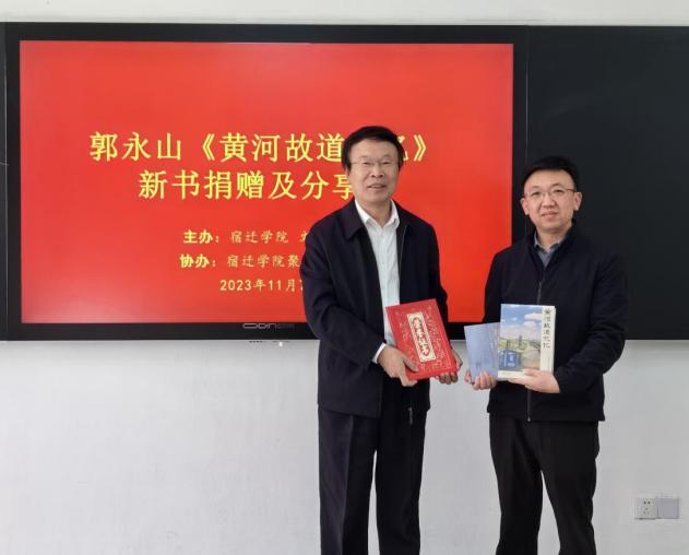 全国“书香家庭”向我馆捐赠新作 作者:刘敏编辑:卢昌模 审核:李明善 时间:2023-11-08 11月7日下午,全国首届“书香之家”获得者、中国收藏家协会会员、江苏省收藏家常务理事、江苏省作家协会会员郭永山来我校与文理学院学子面对面分享读书经验,畅谈读书体会,并现场向我校图书馆捐赠了其父子最新出版的力作---《黄河故道记忆》和《蒸汽波》。图书馆资源建设部杨建永主任代表图书馆接受了捐赠,并颁发捐赠证书。 郭永山新作《黄河故道记忆》散文集由吉林文史出版社出版,其子郭继短篇小说集《蒸汽波》由安徽文艺出版社出版。