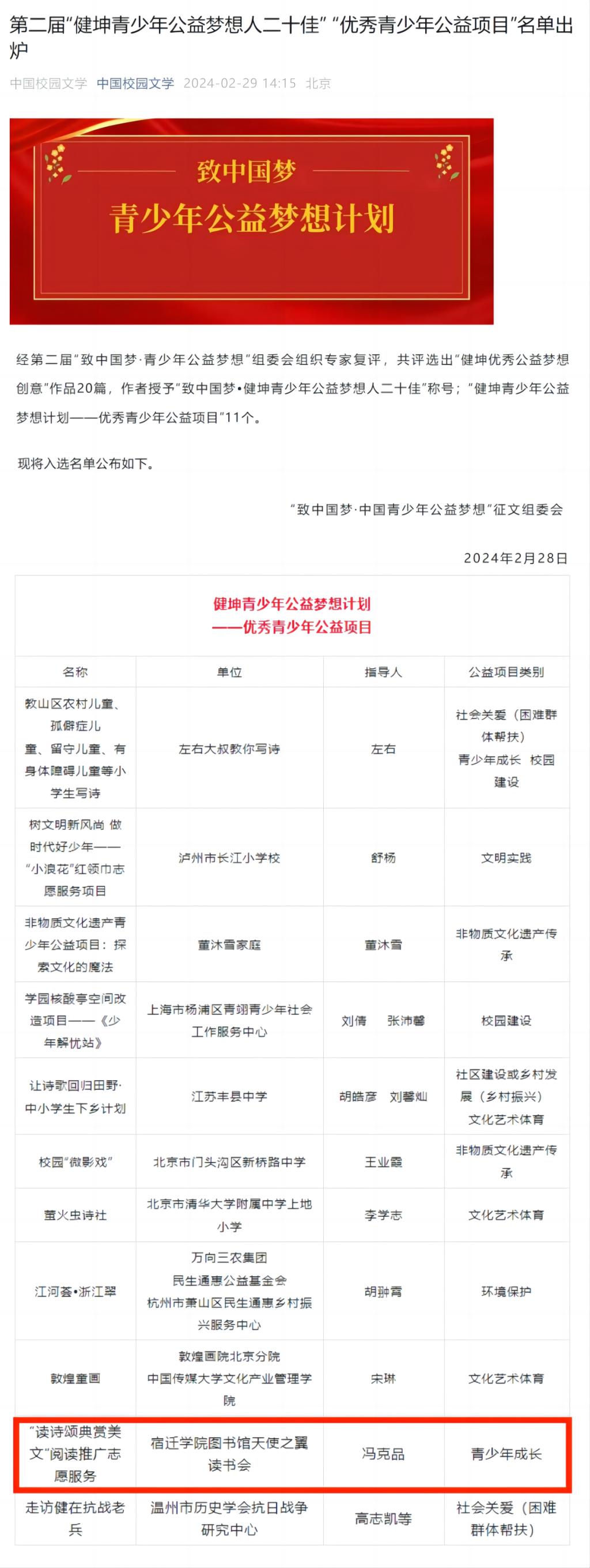 天使之翼读书会“读诗颂典赏美文”阅读推广项目入选 “优秀青少年公益项目” 作者:刘敏编辑:卢昌模 审核:李明善 时间:2024-03-04 日前,《中国校园文学》微信公众号发布第二届“健坤青少年公益梦想计划—优秀青少年公益项目”名单,图书馆天使之翼读书会报送的 “青少年成长”类项目“读诗颂典赏美文”阅读推广项目入选。此项评选活动由中国作家协会旗下《中国校园文学》杂志社联合健坤慈善基金会发起,由“致中国梦·中国青少年公益梦想”征文组委会组织专家评选,共评出“健坤青少年公益梦想计划—优秀青少年公益项目”11个。 “读诗颂典赏美文”阅读推广项目以天使之翼读书会为平台,以宿迁学院图书馆馆员志愿者为主体,由冯克品老师负责,从2015年3月成立以来长期坚持深入宿迁城乡村居(社区),面向中小学生开展全民阅读推广志愿服务,带领孩子们朗读古诗文、诵读圣贤经典、赏读宿迁本土作家优秀儿童文学作品,弘扬中华优秀传统文化,宣传乡土文化,用经典诗文为青少年成长提供文化滋养,激发青少年热爱家乡、热爱祖国、热爱优秀的传统文化,厚植家国情怀,鼓励青少年争做全面发展好少年,为实现中华民族伟大复兴的中国梦而努力。此项目2023年作为“宿迁学院服务基层项目”入选“宿迁市级机关服务基层项目”,受到社会好评。