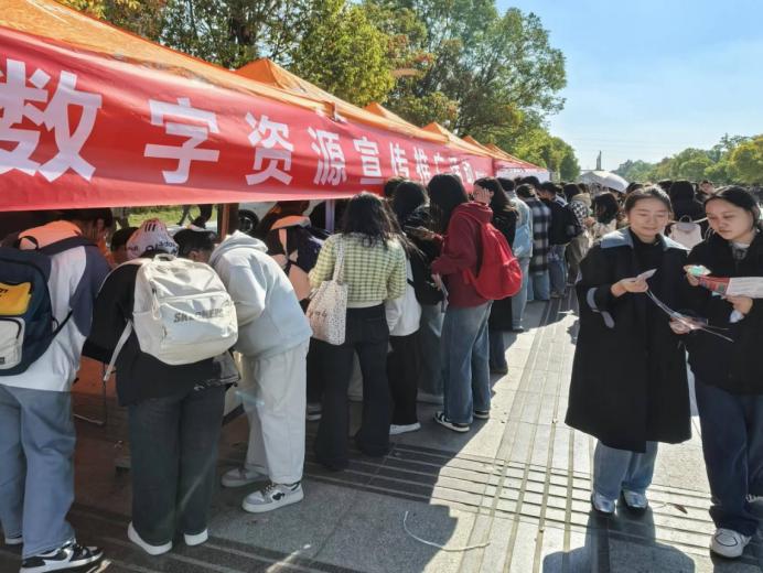 活动当天,英才大道上各类数字资源展板错落有致,吸引了大批师生驻足观看。图书馆工作人员及数据商代表热情地向过往师生介绍各自平台的特色资源、使用方法及最新功能,内容涵盖学术论文、期刊杂志、电子图书、多媒体教学资源等多个方面,充分展示了数字资源的丰富性和多样性。