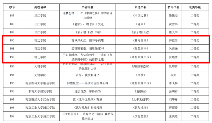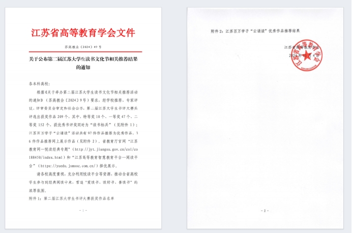 近日,第二届江苏省大学生读书文化节书评大赛的评选结果正式揭晓。据悉,本次大赛吸引了来自全省57所高校的积极参与,共有300份作品进入最终的评审环节。我校在此次大赛中表现出色,共有3篇作品荣获二等奖的殊荣。
