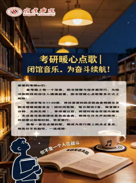 考研暖心点歌|闭馆音乐,为奋斗续航! 作者:徐佳佳编辑:邓纯仁 审核:刘文 时间:2025-11-27 亲爱的考研er们: 备考路上每一个深夜,图书馆都与你并肩而行。为给冲刺阶段的你注入满满能量,图书馆暖心点歌服务正式上线啦! 欢迎在每日17:00前,将你喜爱的励志歌曲音频提交至图书馆借阅服务台(因时间有限,每日限收3首,每首限3分钟,先到先得)。审核通过后,闭馆时就会在馆内播放,无论是治愈旋律还是热血金曲,都将化作无声的陪伴,伴你度过艰难时刻,坚定前行。 愿每一首你点播的歌,都成为前行路上的点点星光。祝各位不负韶华,一战成硕!